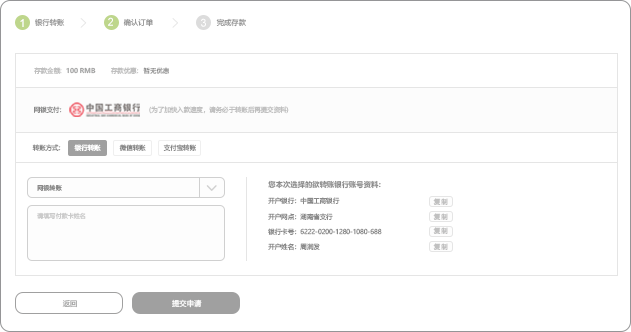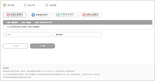 03当您向所选银行账户转之后,您即可来此页面填写转账资料,主要包括填写存入金额、选择存款优惠、选择存款方式、填写备注,点击下一步;